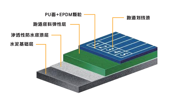 大亨環(huán)保全塑型塑膠跑道其彈性層全部使用高彈性、超耐磨的跑道底料鋪裝,不添加任 何 填 充 物,面層為EPDM彩色顆粒和跑道面漆混合噴涂而成。相對于其它類型的跑道而言,其彈性層不含任何填充顆粒,使其物理性能更加優(yōu)越。