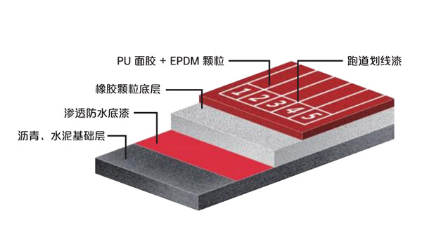 透氣型塑膠跑道采用田聯(lián)認(rèn)可的復(fù)合結(jié)構(gòu),上層為PU顆?;駿PDM環(huán)保彩色顆粒,專業(yè)跑 道面漆材料合機(jī)械噴涂;下層為機(jī)械攤鋪的緩沖底墊。符合專業(yè)田徑運(yùn)動(dòng)員訓(xùn)練標(biāo)準(zhǔn),標(biāo)準(zhǔn)厚度13mm。